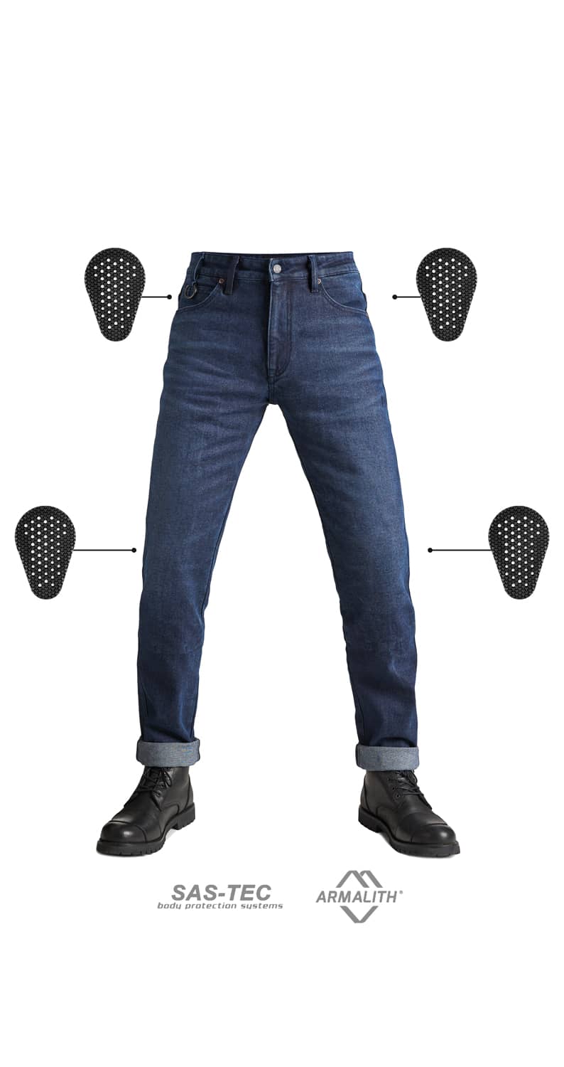 The classic regular waist jeans are perfect for every ride: the ARNIE SLIM BLUE jeans have everything needed to be your one-and-only motorcycle jeans. They are lightweight, stretchy, and extremely comfortable, constructed of protective ARMALITH® fabric which allows these single-layer jeans to achieve a CE AAA protection level. The jeans are a washed blue color, making them easy to match with any outfit. The best part is that you can wear them throughout your day without the typical biker look. The especially flexible yet extremely strong ARMALITH® material is resistant to UV light, friction, and tearing. A special chain stitching technique gives the jeans extra strength and durability, while leaving no visible seams on the outside to maintain a simple and clean design. With this purchase, you can add another great pair of jeans to your wardrobe. The ARNIE SLIM BLUE jeans are available for sale at the Pando Moto online store or retail shop. After all, blue jeans never seem to go out of fashion, right?